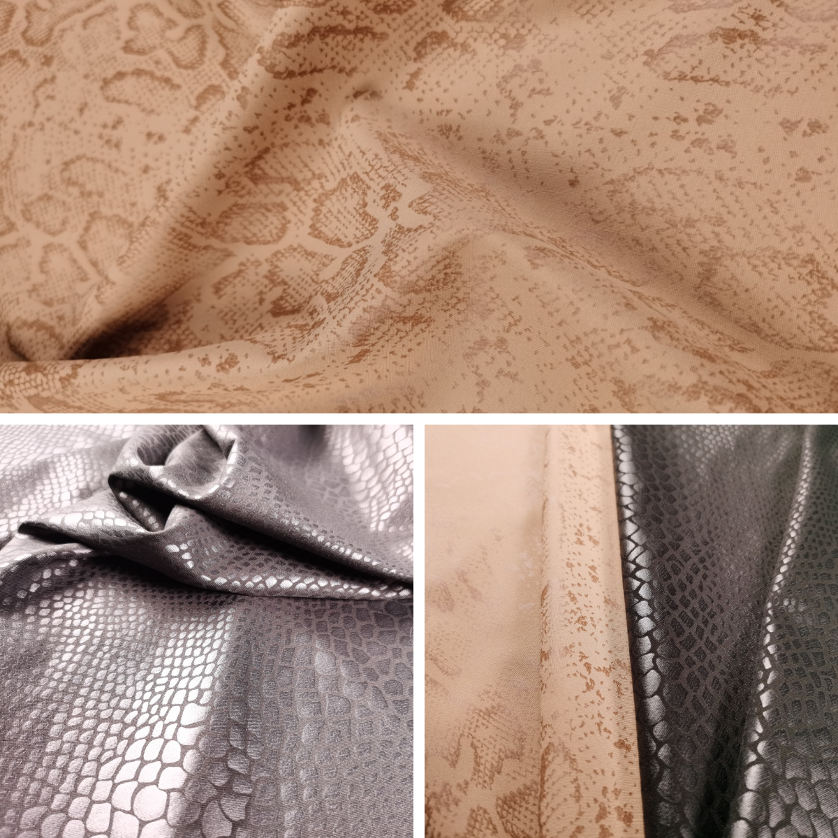這種面料手感柔軟,具有皮質感,彈性適中,表面的動物花紋給此款面料增加了低調慢熱又狂野冷艷的靈魂。此種動物花紋中,蟒蛇紋最為突出,它可一直都是潮流的寵兒,復古大氣,浮夸中性,而且不難駕馭。無論是上衣、褲子、外套、鞋子、配飾等等,都很受消費者喜愛。