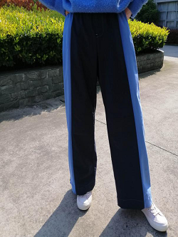 該款面料由含彈力仿棉錦滌交織而成。面料具有吸濕快干功能,且耐磨性、彈性好。面料肌理清晰,質地柔軟舒適。藍黑撞色設計,更顯時尚感,點綴褲身增添活力。松緊腰部,彈力不拘束,方便日常穿脫。